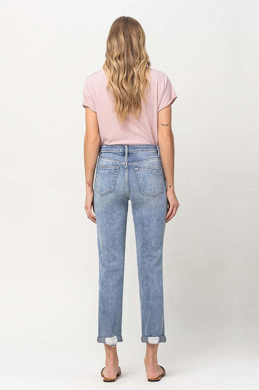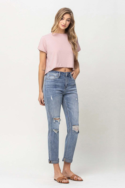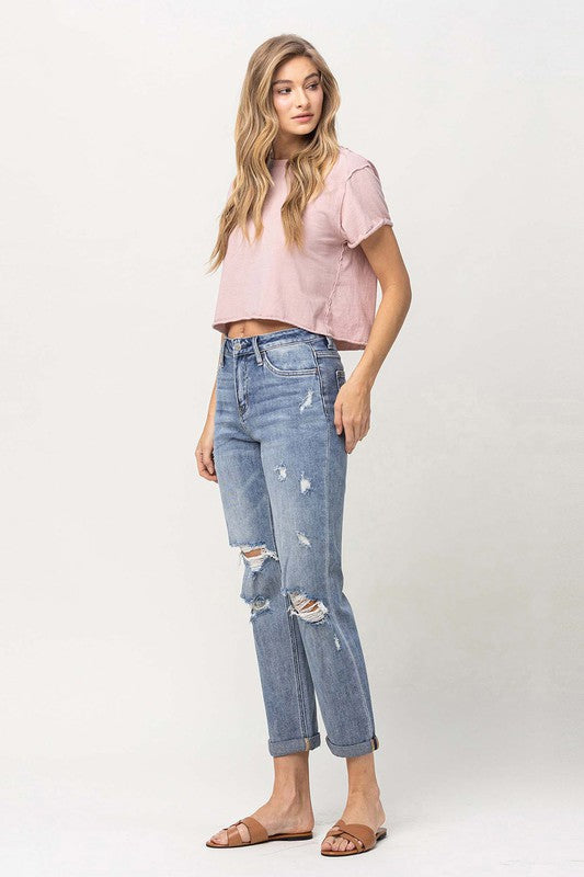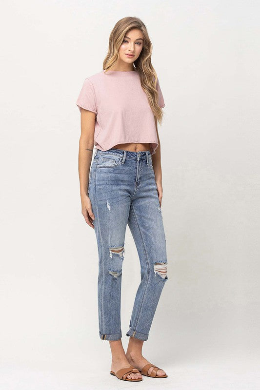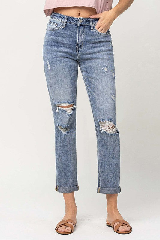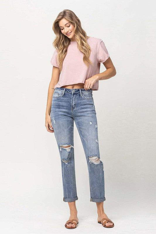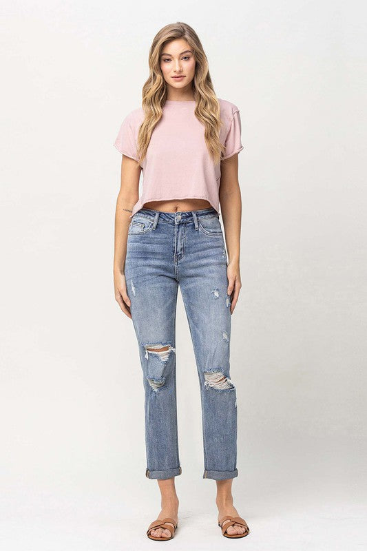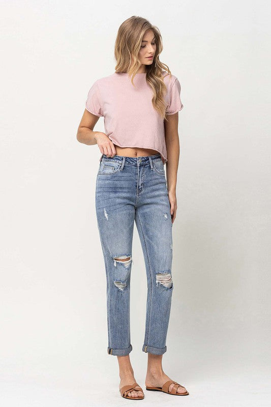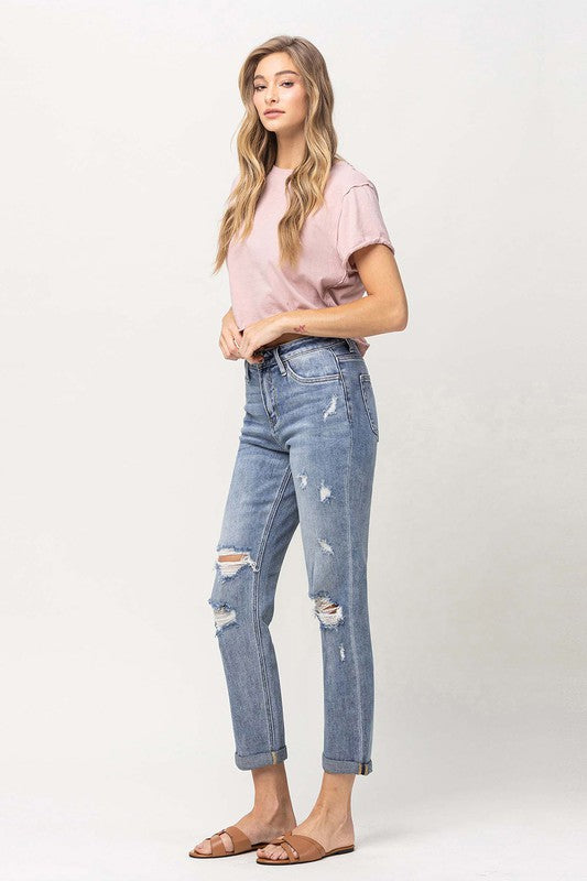 Elevate your casual style with our Distressed Stretch Boyfriend Jeans. These jeans stretchy offer a slouchy fit that's perfect for a relaxed yet fashionable look. The distressed detailing adds a touch of edginess, while the double cuffed hem adds a trendy twist.