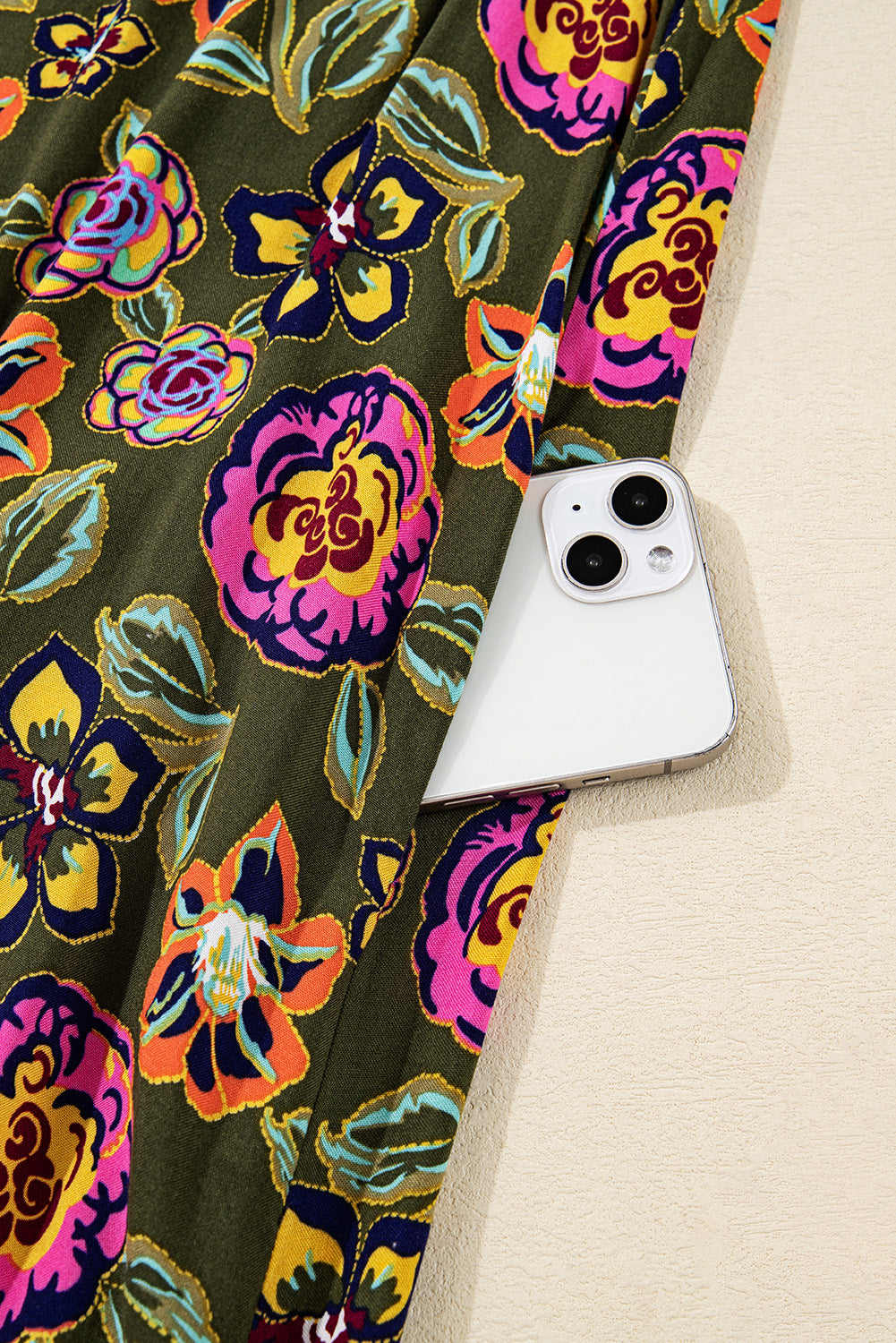 Green Floral Print Split Neck Bubble Sleeve Shift Mini Dress