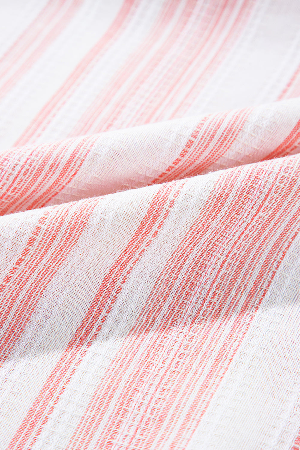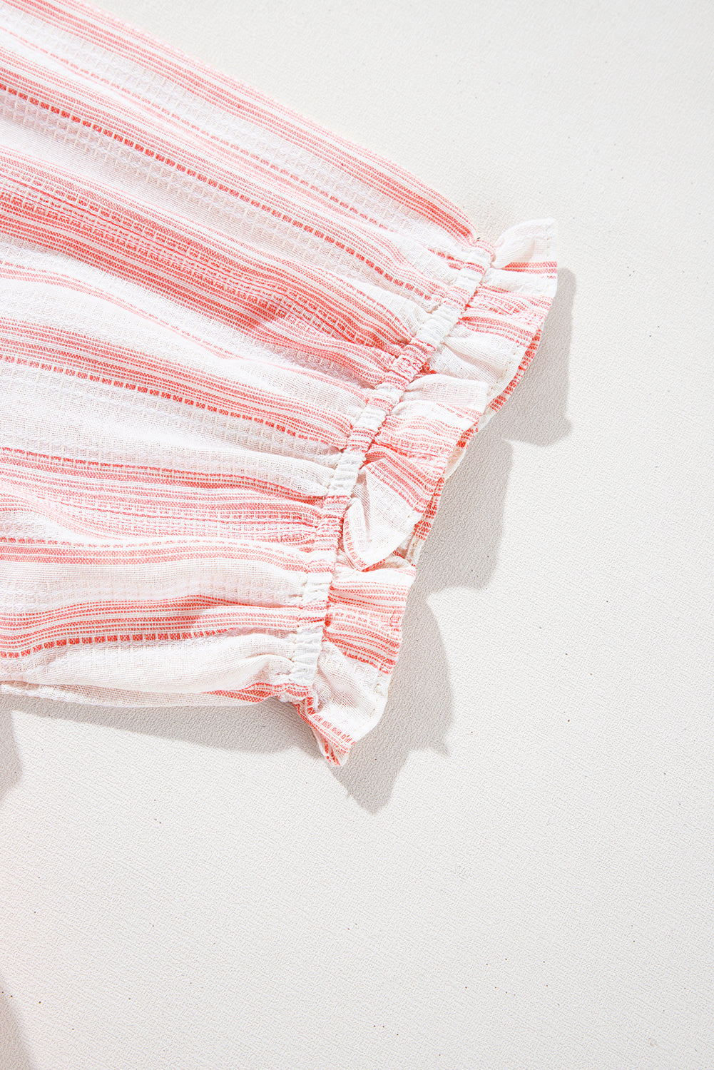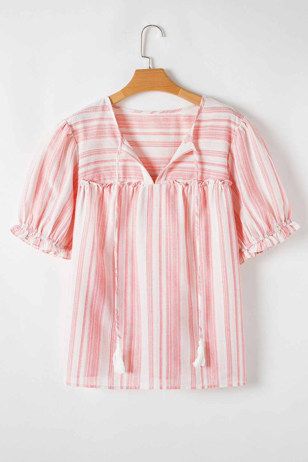 Pink Stripe Plus Size Tassel Tie Frilled Detail Short Sleeve Blouse