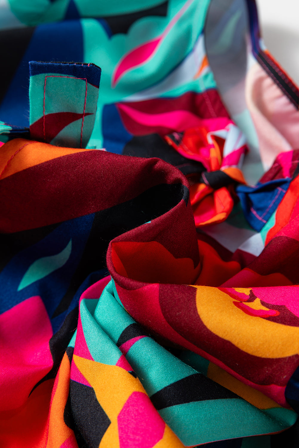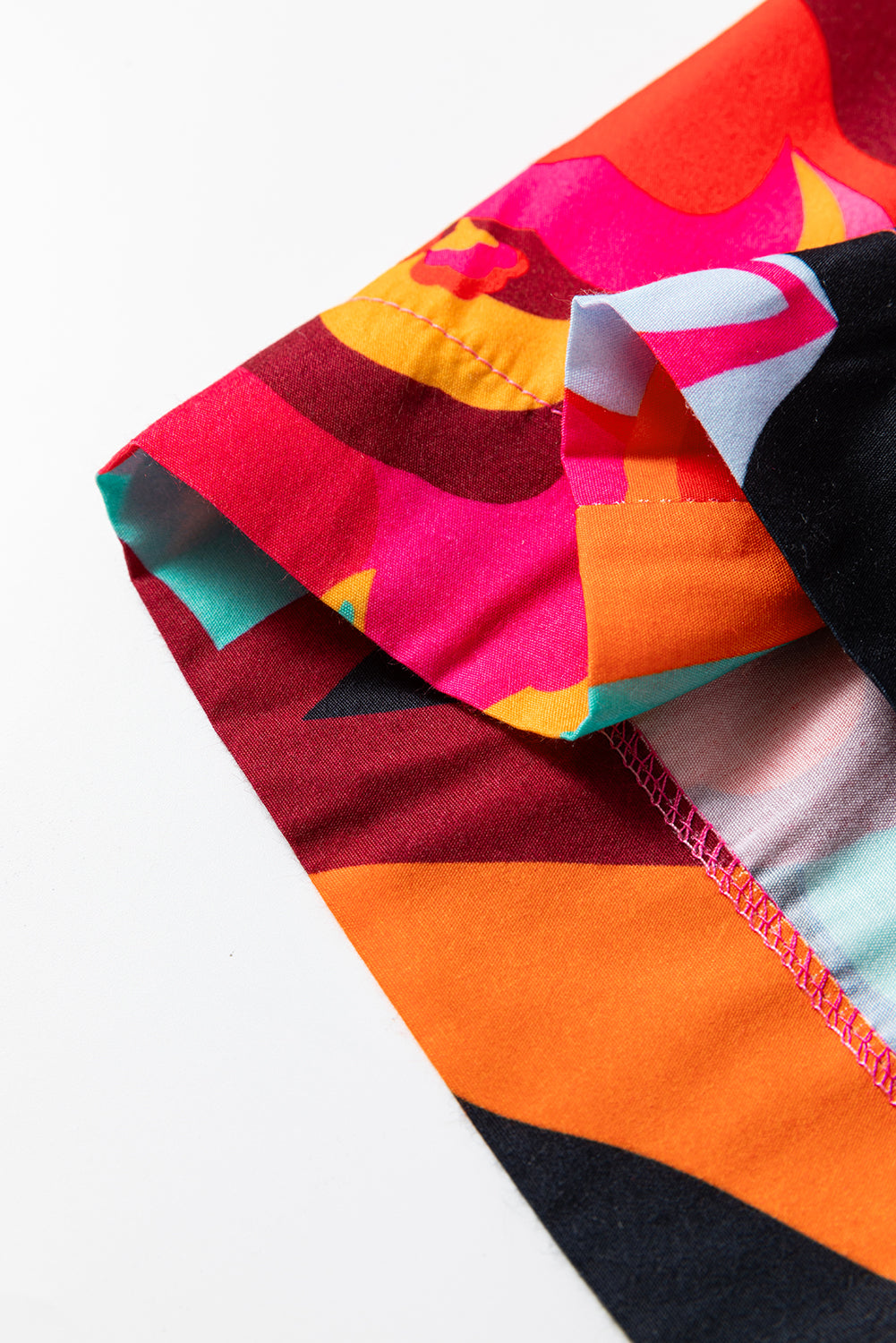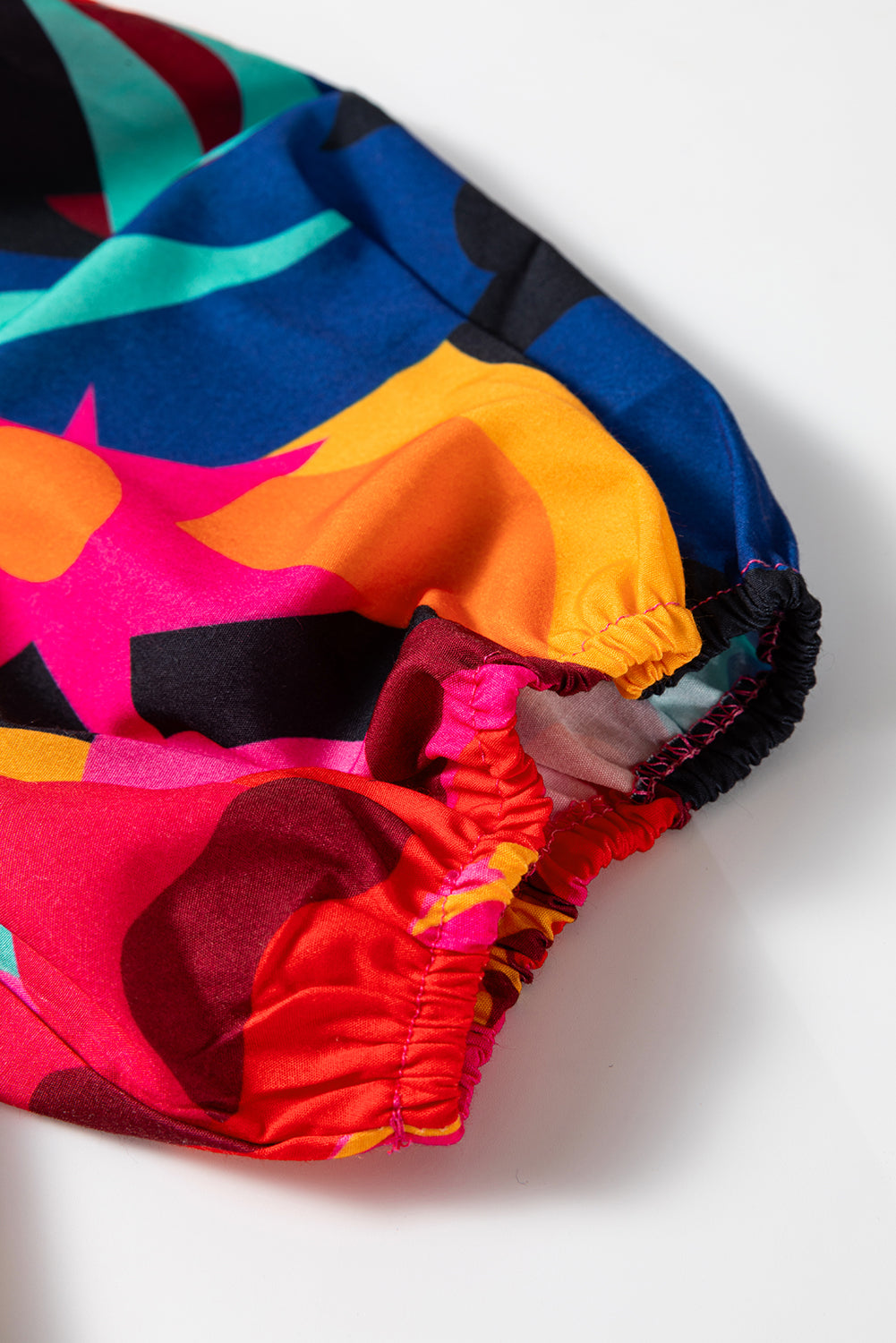 Red Abstract Floral Print Front Tied Puff Sleeve Babydoll Blouse