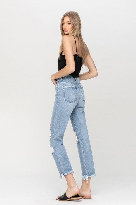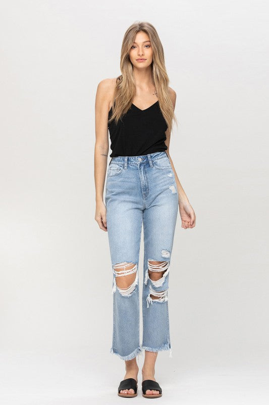 These non-stretch denim jeans offer an authentic and rugged texture, complemented by distressed details for a worn-in look. Their super high-waisted fit and relaxed straight legs provide comfort and style, while the hidden button-up closure maintains a sleek appearance. The fray hem adds a touch of vintage charm, making these jeans a standout choice for fashion-forward individuals looking to capture both the past and present in their style.